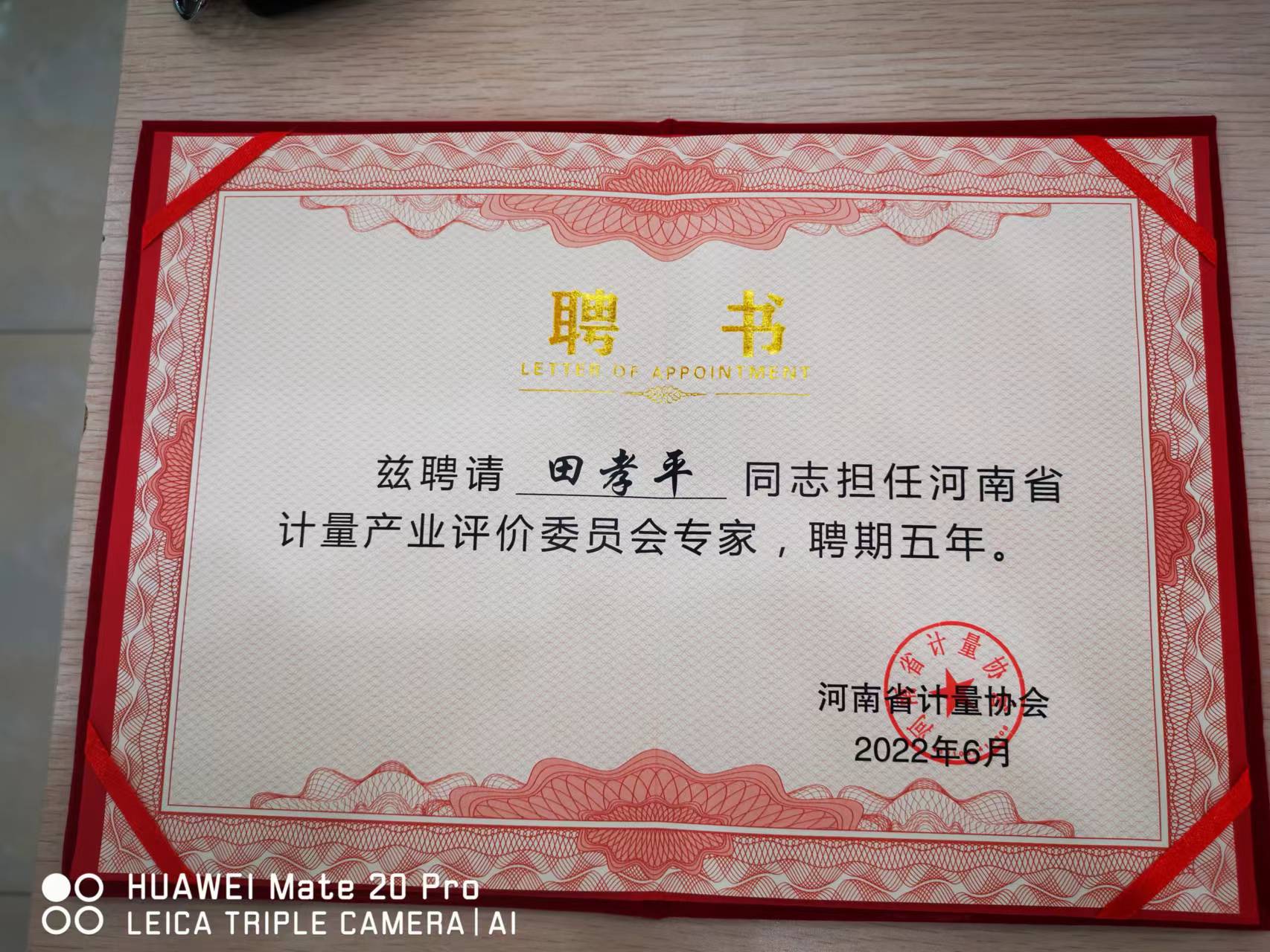 恭賀鄭州貫奧儀器儀表有限公司田孝平總經理被聘請為河南省計量產業評價委員會副主任委員及委員會專家。