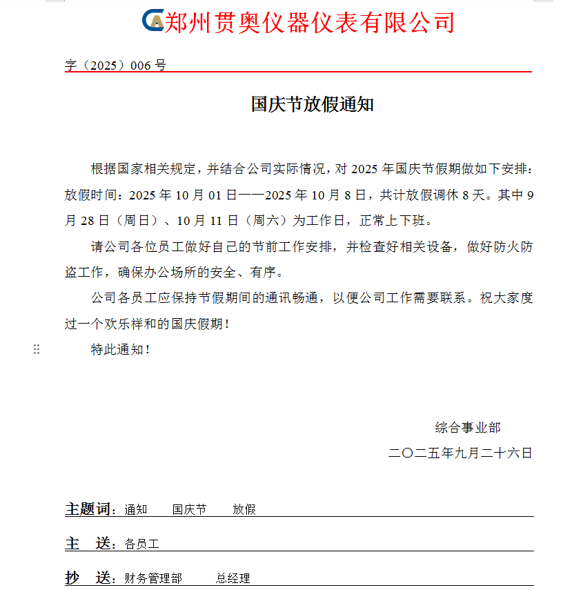 根據(jù)《國務(wù)院辦公廳關(guān)于 2025 年部分節(jié)假日安排的通知》精神,結(jié)合公司運營實際,現(xiàn)將國慶節(jié)放假、福利發(fā)放及相關(guān)事宜通知如下: