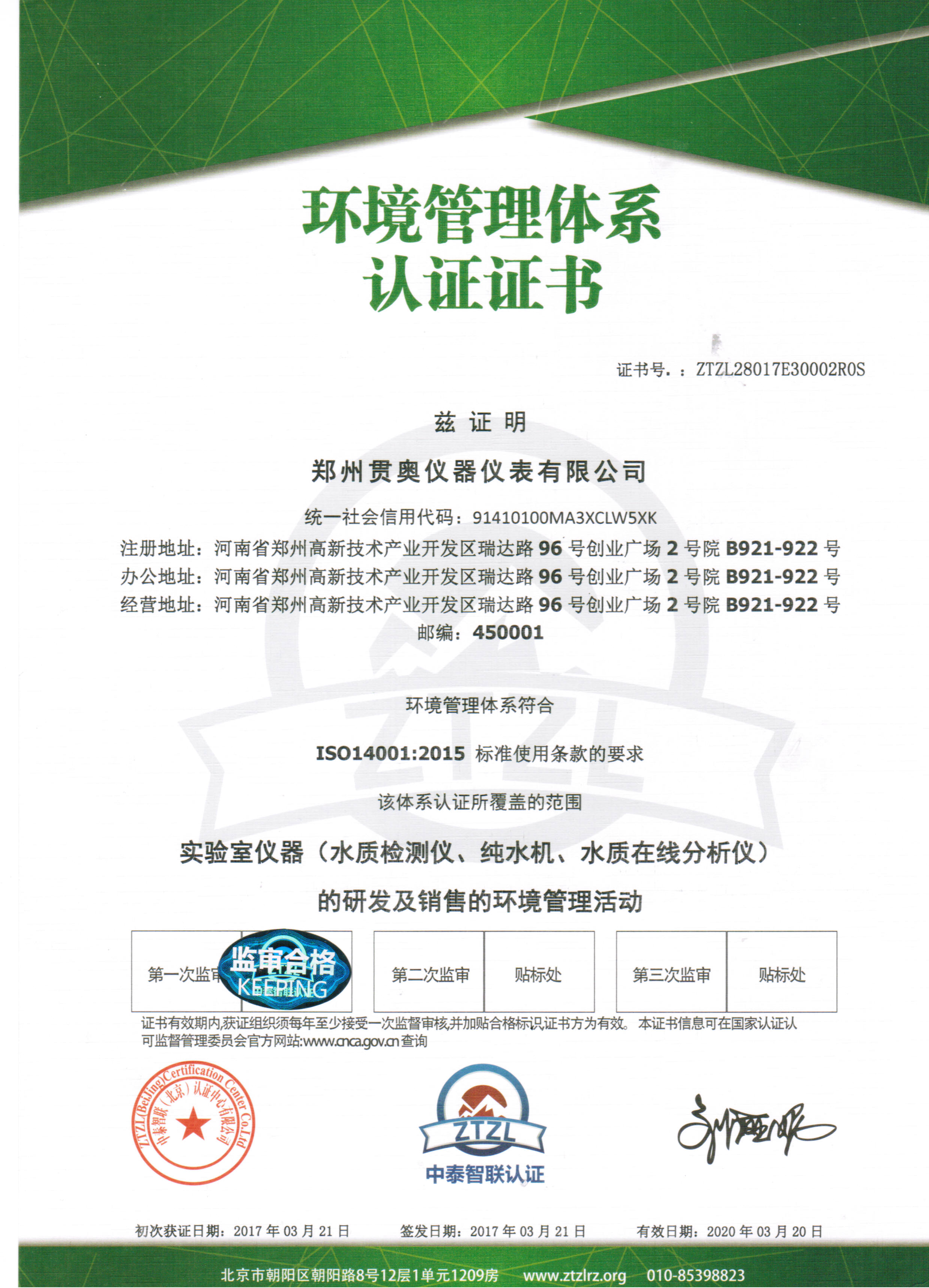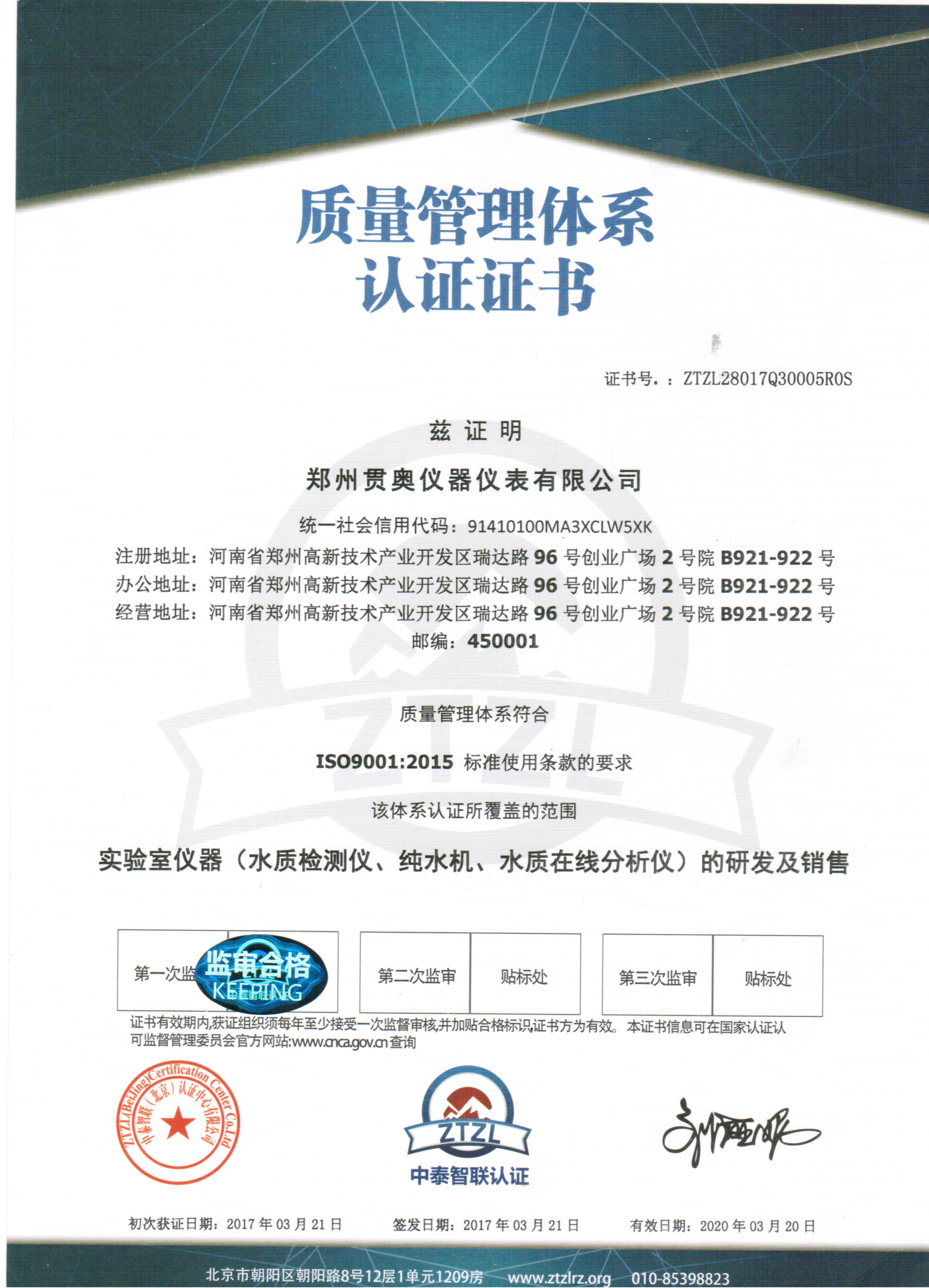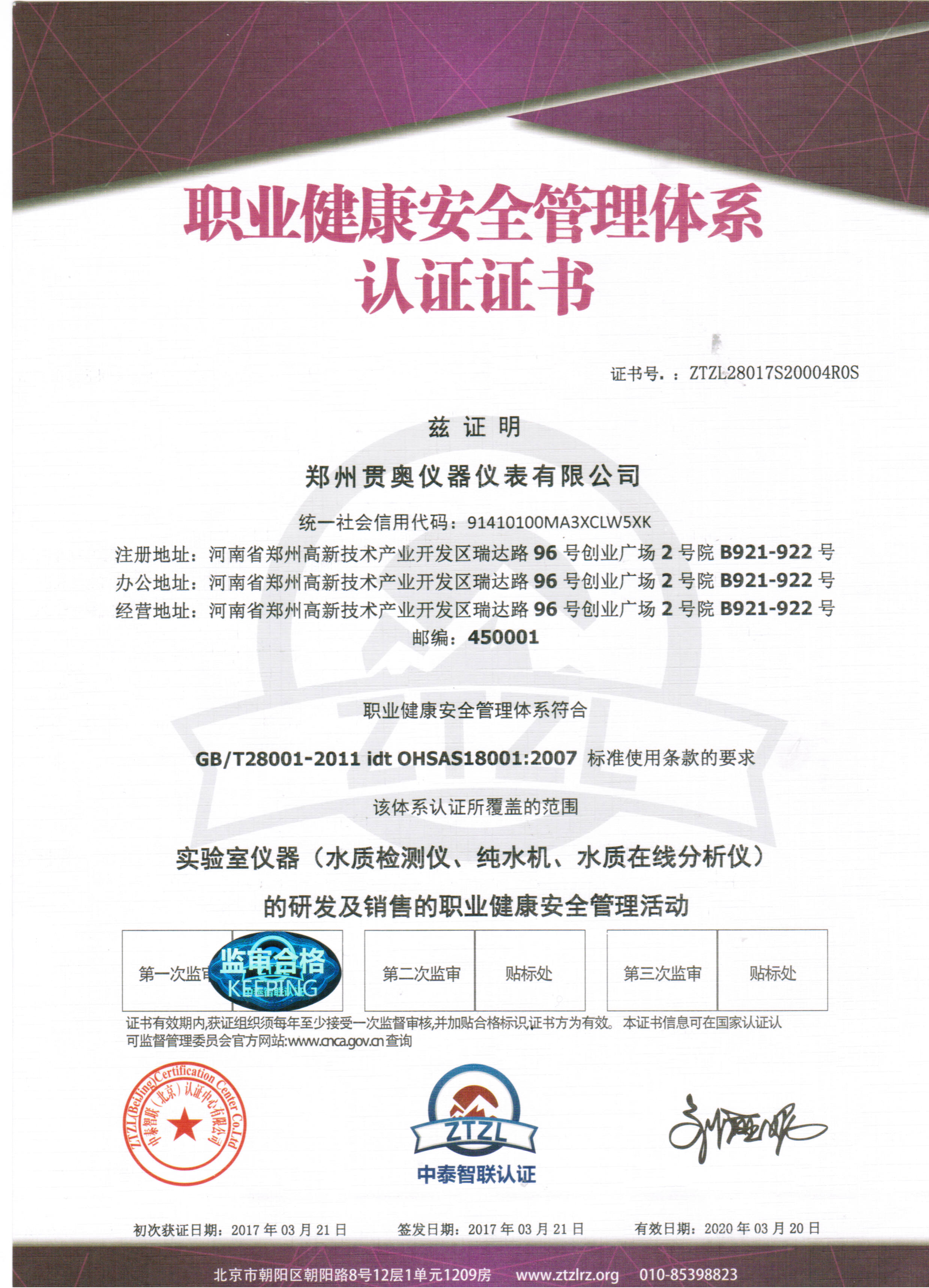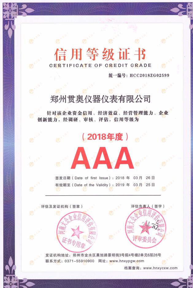 鄭州貫奧儀器儀表有限公司的所有設(shè)備均經(jīng)過省級計量院認證和檢驗,貫奧其儀器儀表非常重視知識產(chǎn)權(quán)的研發(fā)和保護。公司獲得了"ISO9001:2015"質(zhì)量管理體系認證證書,ISO14001:2015環(huán)境管理體系認證證書,OHSAS18001:2007職業(yè)健康安全管理體系認證證書。鄭州貫奧儀器儀表有限公司企業(yè)信用等級評級"AAA"。
