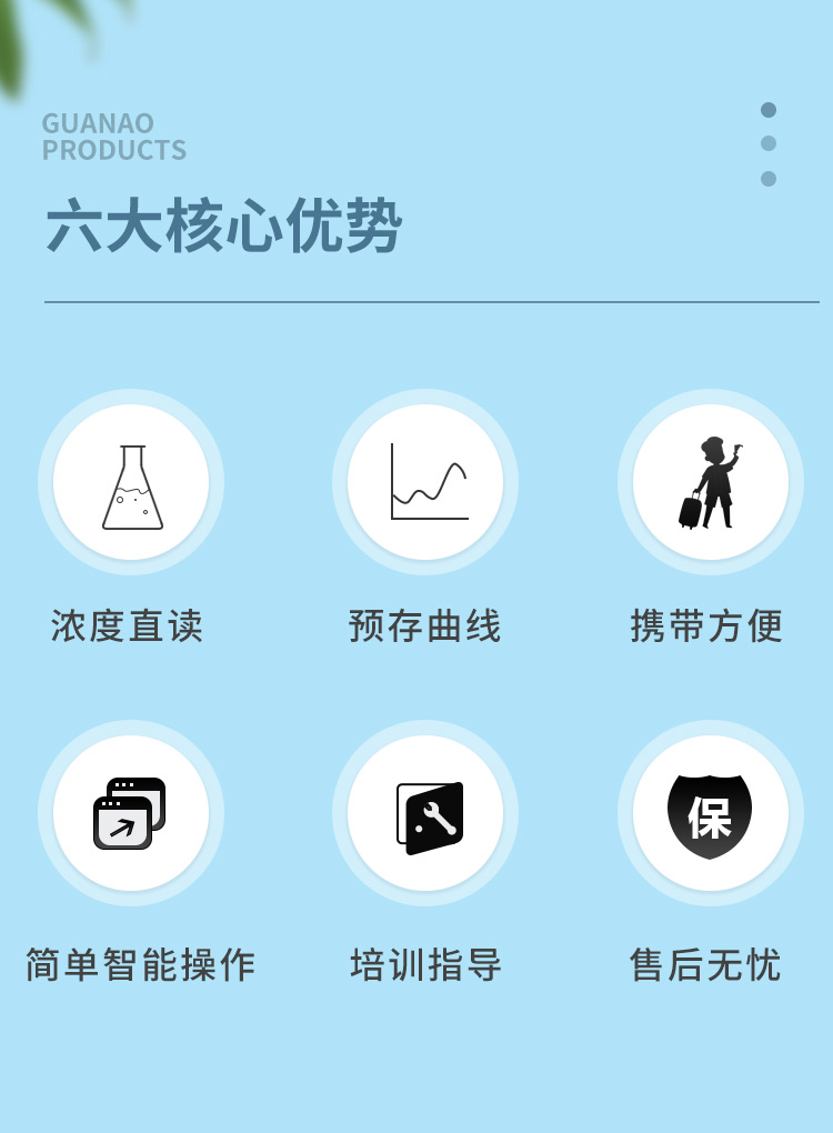 靛藍檢測法(即分光光度法)。其原理是含臭氧的氣體在有多孔玻板的安瓿管中通過三磺酸靛藍的脫色確定臭氧水溶液的濃度,生成的溶液用分光廣度計在 610nm 處測量,通過計算得出臭氧濃度。這種方法雖然干擾少測量準確,但操作比較復雜,并且容易損壞玻璃安瓿。